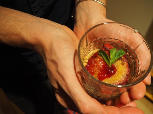 - Arrange in glasses / glass jars / bowls – I started with a layer of sauce, then crumble, then a plum half and a bit of its juices, a bit more sauce, and then garnished with a sprig of mint.