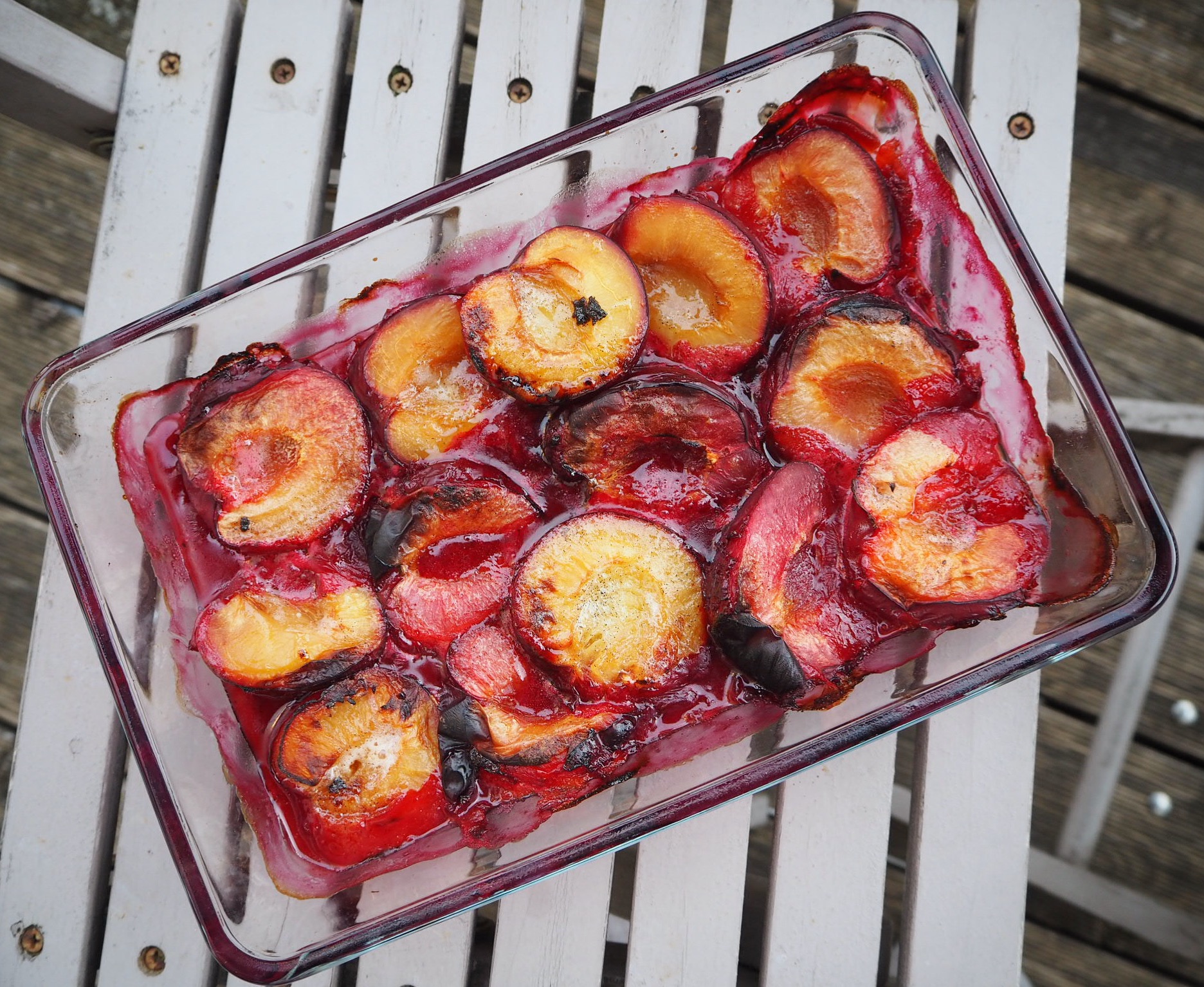 - Pour the honey mixture evenly over the plums and bake for 25-30 minutes. Remove and let cool.