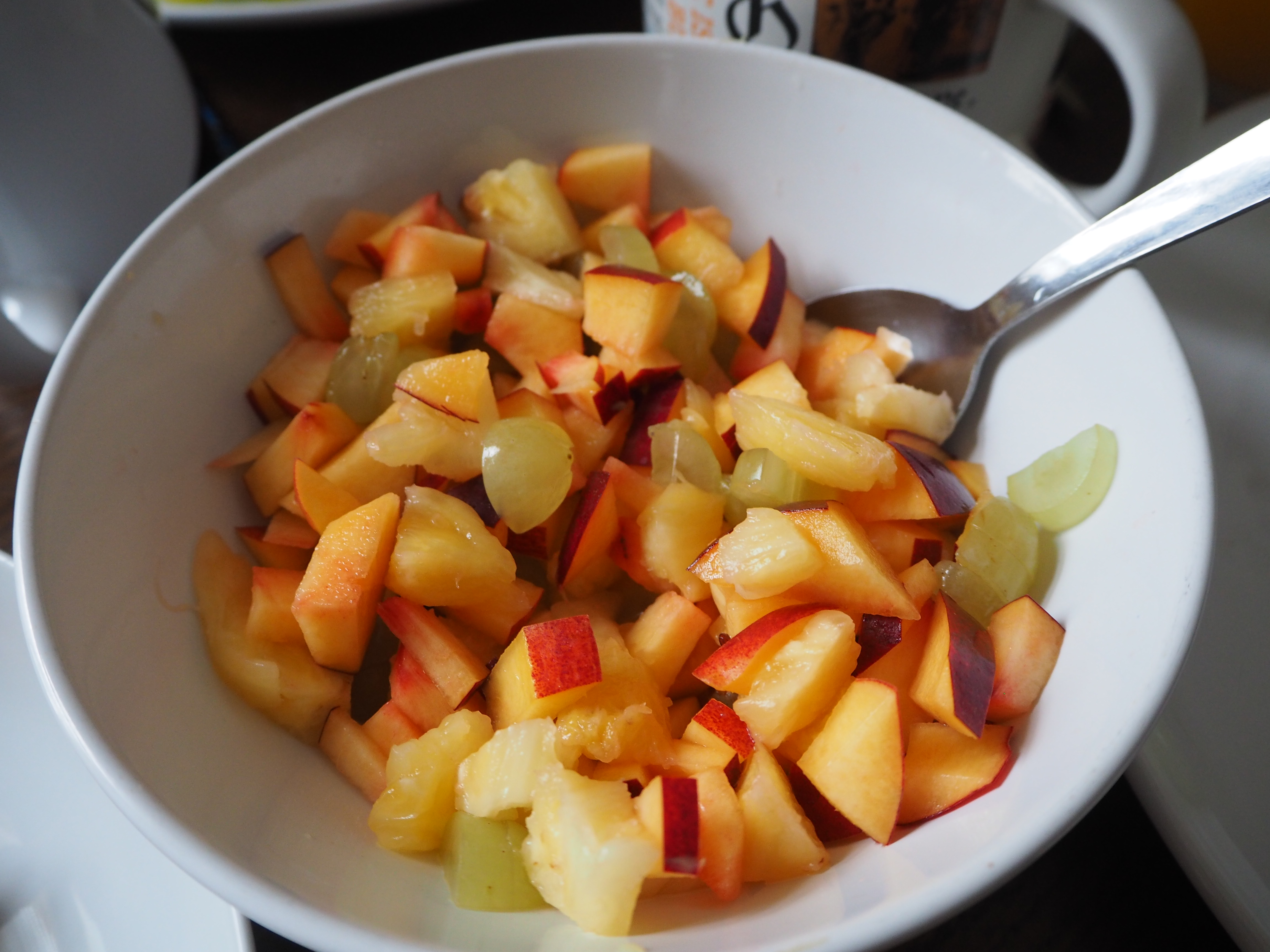 A simple brunch: Bagels, scrambled eggs, and bacon with freshly squeezed orange juice and other fruits